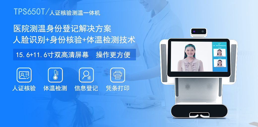 天波人证核验测温一体机TPS650T是由广东天波自主研发和生产的一款基于人脸识别算法和红外热成像测温算法的体温检测终端,采用RK3288、4核高性能CPU,可以选15.6+11.6寸双高清屏幕形态或者单屏形态,操作更方便、运行更流畅;采用500W单目摄像头,性价比更高;采用AI测温芯片,精准测温;采用安卓5.1操作系统,同时开放接口给客户进行二次开发,助力各行各业快速实现人脸识别测温功能。