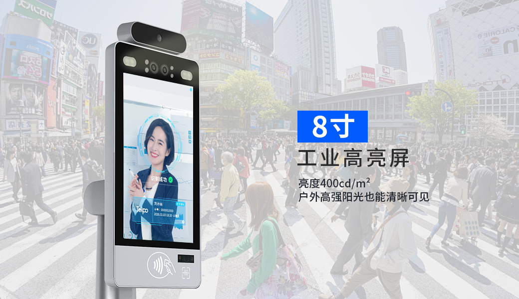 天波人脸测温健康码核验终端F2T内置的8英寸高亮度工业电容触控屏,分辨率800*1280,亮度400cd/m² ,宽温工作下即使是户外高强阳光也能清晰可见,支持五点触控,整体简洁大方。