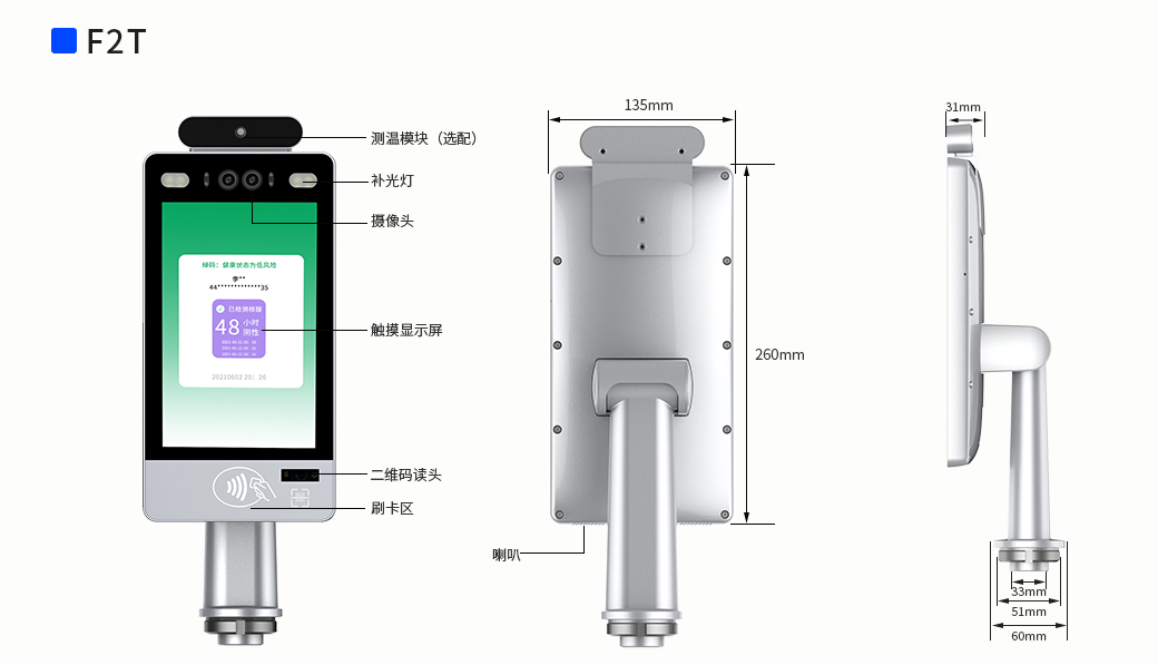 天波人脸测温健康码核验终端F2T,支持健康码识别,体温检测功能,助力各行各业快速实现零接触防疫。