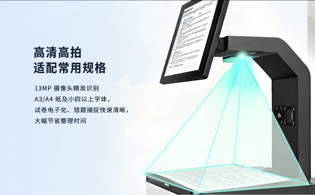 AI智能错题打印设备配备13MP高清高拍摄像头,能精准识别A3、A4纸小四以上字体内容。老师无需逐页手动录入,只需将试卷放入拍摄区域,设备就能快速完成电子化收集与上传,大大节省试卷整理时间;学生整理错题时,也能清晰捕捉题目细节,确保错题内容完整准确。