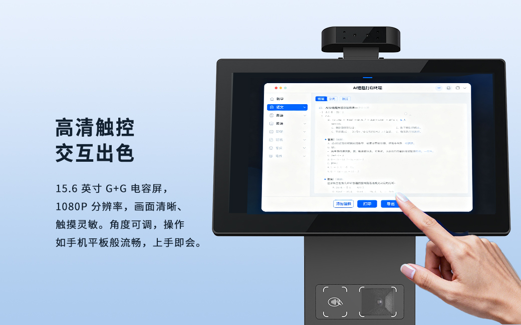 AI错题打印终端配备15.6英寸电容触摸屏(G+G材质),分辨率高达1920*1080,画面清晰细腻,触摸灵敏不漂移。角度可调节,师生都可以方便操作设备,无论是选择功能、上传文件,还是预览错题,都能像使用智能手机和平板一样流畅顺手,无需花费额外时间学习操作,上手即会。
