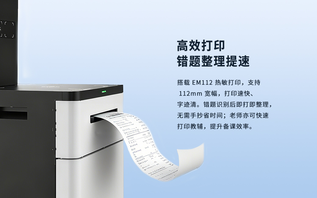 AI错题打印一体机搭载EM112热敏打印功能,支持112mm宽度打印,打印速度快、字迹清晰。识别错题之后,可快速完成打印,及时整理到错题本中,不用再手动抄写,大幅节省错题整理时间,让精力更多地集中在知识点巩固上;老师也能快速打印教学资料,提升教学准备效率。