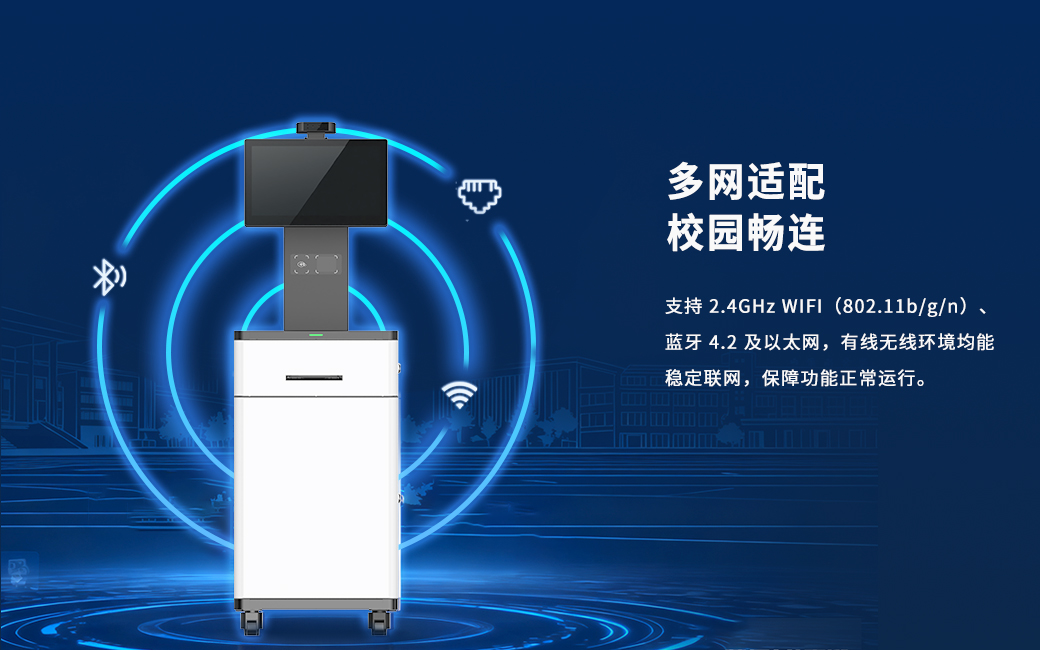 AI智能打印一体机同时支持WIFI(802.11b/g/n,2.4GHz)、蓝牙4.2和以太网三种网络连接方式,无论校园内是有线网络还是无线网络环境,设备都能稳定联网,确保各项功能正常使用。